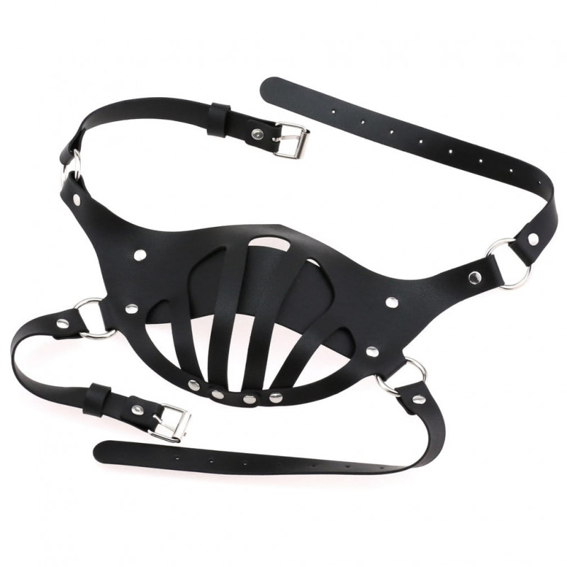 Нескромная маска БДСМ "Disguise" для любителей доминировать и подчиняться. Выполнена из экокожи, декорирована металлическими заклепками.